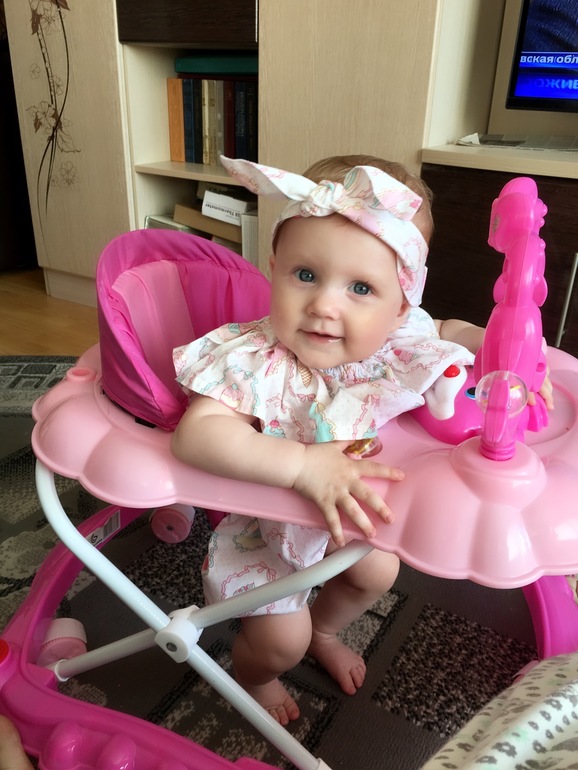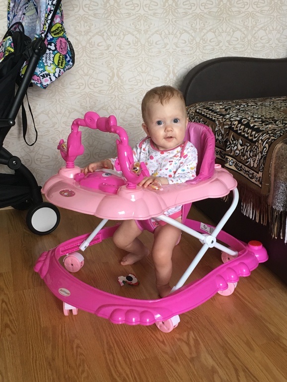 Появилось у нас много новых звуков, машем "привет-привет", у опоры встает и передвигается понемногу, в ходунках ходит прям отлично, за обе ручки тоже ходит хорошо, наверное не за горами самостоятельная ходьба💪🏻