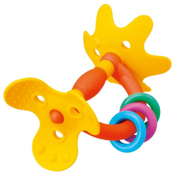 у нас куча всяких погремух, однако в 2,5 месяца, когда дочь начала учиться все хватать, она залипала именно в эту (самую простую в ее арсенале), могла все свое бодрствование пытаться ее теребить.