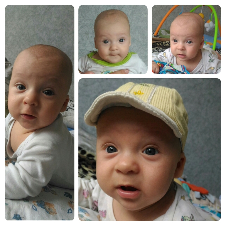 Что имеем: как исполнилось 3 месяца,начали брать игрушки в руки, платочек сам перекладывает из одной руки в другую, вертится как червячёк😊 перевернулся сам на живот 1 раз (увидела когда с кухни в комнату зашла), а остальные с моей помощью (плечо просто чуть не доворачивает), пытается что то там ползать, хорошо отталкиваться от моих рук, ноги пытается подогнуть, только про руки забывает😆 Жду заливного смеха, но пока с этим, ну ни как🙄 Улыбается только и какие то попытки посмеяться есть. Любит смотреть телевизор😬 как будто что то понимает!!! Но он же яркий и с меняющимися картинками. За руки мы любим давно подниматься, не любим лежать, старается присесть что ли 🤔 пресс качает, когда на животе у отца, спиной лежит. Когда на руках ношу (вертикально, его спина к груди моей), всегда вперед наклоняется и взгляд не вниз, а перед собой. Вес примерно 7 (дома взвешивали, на напольных весах). Слюни ручьем, кулаки и пальцы в рот. Гулим во всю 😍 Еще поперек кровати теперь ложимся сами и вообще вертимся как хотим😏