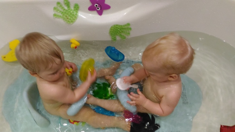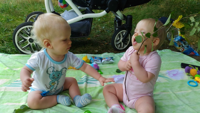 Вот так мы выросли. С 9 месяцев у нас прям прогресс по умелкам. Оба показывают на куколке глазки, ротик, носик. Оба делают Ёжика (носик морщат), машут "Пока" , Показывают "Нельзя"!(грозят пальчиком), Научились сползать с дивана попой и становятся на пол. Играют ладушки, обожают кататься на фитболе, дома все открывающиеся завязанно, заклеянно, запечатанно. Бъющее и пачканное все убранно на самые верхние полочки и ящички. Лезут везде, где только достать можно. Играют в игрушки ТАК, что ступить потом негде. Порой хочется выкинуть все))))Если лежит книжка, то надо эту книжку сразу двоим! Начинают отнимать у друг друга, рев, разруливаю все я! Кушаем уже и рыбку. Наконец-то. Баночная рыба у нас не пошла, а вот мною приготовленный минтай уплетают. У Максика 6 зубов (выходят парно, лезут еще два), у Мару всего 2 нижних(десна просвечивают, будто все зубы в раз вылезут). Сон. Спим после завтрака часик, когда пол часика и дневной сон 1,5 часа. От вечернего плавно отходим. Если дома, то не спят.Если на улице, то могут подремать мин 40. Купаемся все так-же каждый день, единственное за минусом , когда воды небыло, грели и купались в тазике. Оба топчаться около опоры. Могут держаться одной рукой. Макс порой пытается проверить свое ровновесие и вообще стоит без опоры секунды 3. Потом с перепугу хватается и садится на попу. Кстати, я переживающая мамаша , что мой сын ползает лишь только по пластунски наконец-то успакоилась. После назначенных уколов "Церебрализин" классный препарат моего сына будто подменили. Стал спокойнее, начал много болтать и повторять за мной. Дадада, Бабаба, Деда,Мамама,Амамам(кушать)))ну и много слогов, но уже не по русски, а на своем ляличном языке))) И наконец-то ПОПОЛЗ!!!НА 4х косточках( так говорит наша бабушка))))Мы с мужем увидив, что сынишка ползет на четвереньках прослезились. (он полз не уверенно, как будто только что родившийся котенок, но полз!)))) Все мамы меня поймут. Садиться сам, без опоры и без помощи.