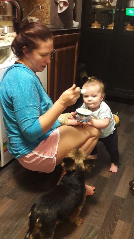 Налила борщ себе,взяла банку сметаны,Веруня увидела и стала просить,дала ей попробовать,потом в ее тарелочку положила и как положено со слюнявчиком и за столом деть ел.А фото просто смешной факт из дедячей жизни,многие и похуже постановочные фотографии делают.