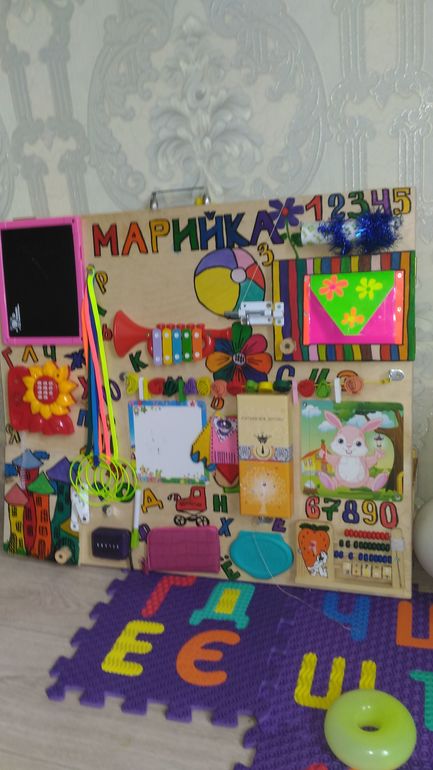 На нашем дверца, шпингалеты, колеса( вот их она обожает). К выключателю равнодушна. Зеркальце можено ещё. Вилку с розетками специально не делали, чтобы не думала, что это игрушка
