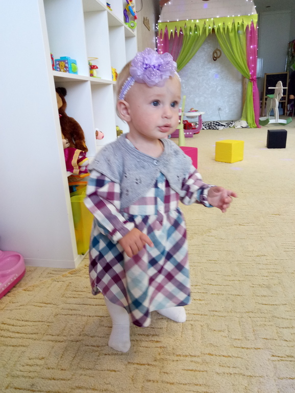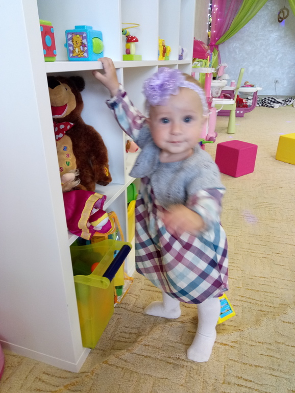 - Речь: мама, папа, дядя, ам-ам, гав, кии ( кошка), дай, на, де (где, если что то ищет), топ ( когда хочет сама идти),