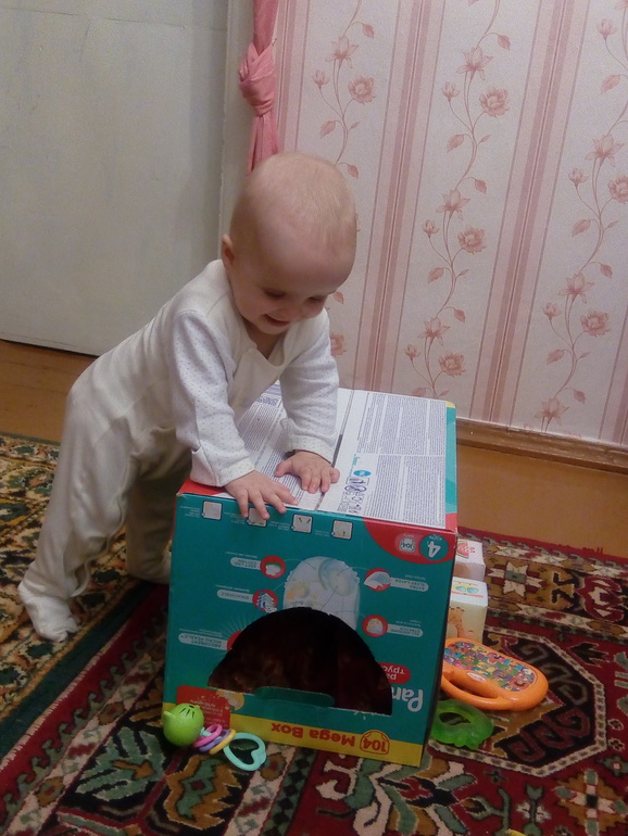 Вообще, как вы видите по характерной дырочке-входу, это домик для нашей Аськи (кошки), но Лиза решила, что нифига это не домик, а «ходилка»)))))))