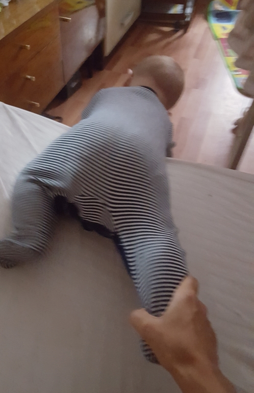 На коврике его не удержать, понял что можно ползти из комнаты на кухню, например. Сам доволен очень!