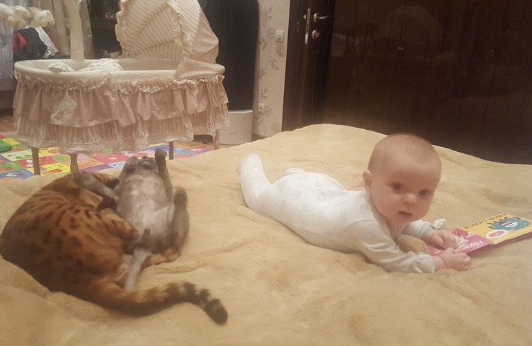 Скоро люлька будет уже небезопасна, сможет выбраться, пора собирать уже "большую" детскую кроватку. Ну собственно, сейчас в люльке спят чаще всего коты!)