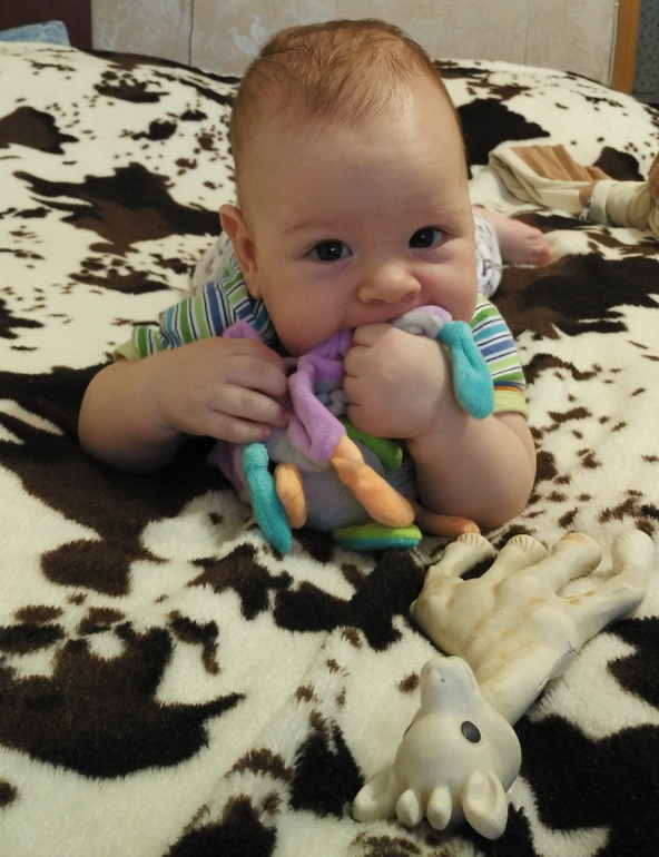 Рост-70см, вес 8200гр, зубов-0. Активно лезут зубы, потому как стал очень беспокойный, руки во рту, слюни, всё время чешет дёсна, грызет все.