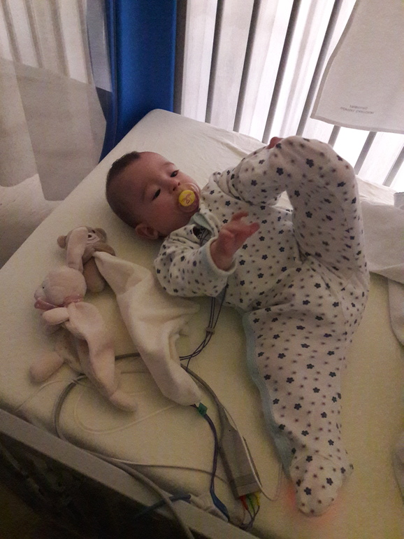 это наутро после трудной ночи. Всё ещё обмотана проводами, на груди и на животе электроды, в руке капельница и шина, чтобы капельница держалась.