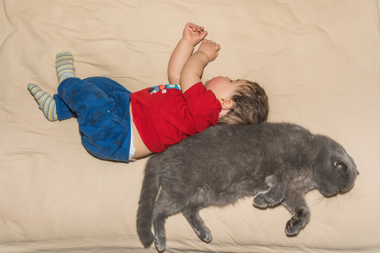 Нашему коту запрещено заходить в комнату с ребёнком, потому что он дурак дураком. С самого начала, как забрали полуторамесячным котенком, он не рассчитывал силу укуса. Может прокусить руку взрослому, а младенцу с его нежной кожей и подавно. Но это он не со зла, а по дурости. В остальном очень даже мил. Очень его интересует малышка, но вроде понимает, что ему с ней играть нельзя. Почти всегда дежурит под дверью комнаты с ребёнком.
