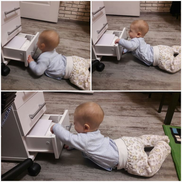 интересно, что вчера целый день я лазила по всем ящикам в доме в поисках одного документа. Видимо за ночь у малыша информация переварилась и с самого утра целенаправленно он пошел к ящику. :)