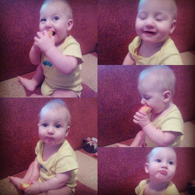 Даю гречневую кашку, овощным пюре плюется, а вот яблочное любит. Ещё ему понравился творожок и банан: вкусненько и сладенькое ) Когда ему надоедает, делает пффф ) Еще даю нашу еду. Уже спокойно справляется с яблоком. Даю прямо дольку, он кусает и жуёт. Поначалу иногда давился слишком большими кусками.