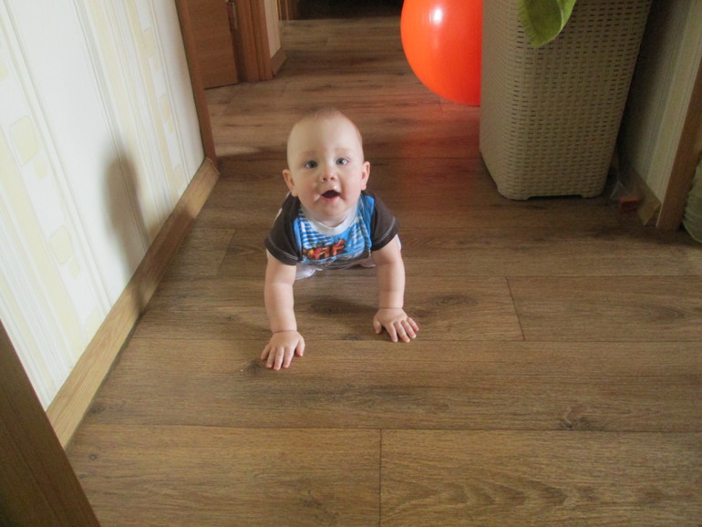 Из физических умелок появилось только то, что ненадолго стал отпускать руки от опоры, секунд 10 так может постоять, чему сам рад безумно)) В остальном, все так же шустро ползает по всей квартире, все исследует, ящики и шкафы, двери сам пока не открывает, но если заприметит где-то что-то не закрытое, то бегом туда (например шибко нравится туалет, туда несется сломя голову с восторженным визгом). Нравится ему чтобы водили за ручки, делаем это не часто, пробовали садить в ходунки, но с ними как-то не задалось, минута - и начинает плакать. Ну нет и нет))) не заставляем))