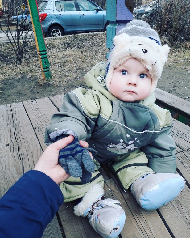 На прогулкеНикита сегодня в первый раз гулял не на сон. Минут 20 он полул ежал в коляске. Потом ему это надоело и я его взяла на руки. Гуляли во дворе. Я сидела на скамеечке с Никитой, а старший, Денис, рядом гулял.