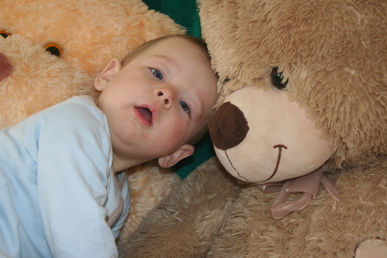 🔹 говорит: мама, папа, баба, Алик (кот), кись (кот), Няня (Настя), Така( Таня), деда, дай,гав, кря, ква (последние в частности повторяет, если сказать, очень редко сам)