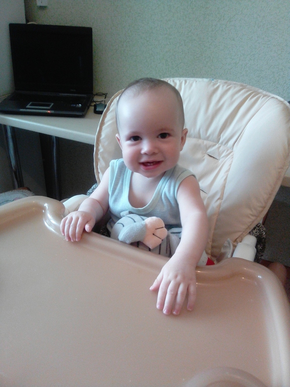 Аппетит то есть, то нет, так как стоять в стульчике для кормления и орать, одновременно подпрыгивая и пытаясь стянуть что-нибудь с рядом стоящего стола, намного интереснее! Начали пробовать есть кусочками: то яблоко погрызем, то картошку отварную, сегодня вот ели едва взбитый блендером суп. Жуёт хорошо.