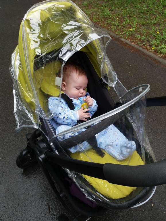 Погода в этом месяце идиотская: то дождь и холодрыга, то жара)Первый раз вышли с дождевиком) Ванюша сначала долго рассматривал его изнутри, а когда дождь закончился, требовал вытянуть его от туда😁