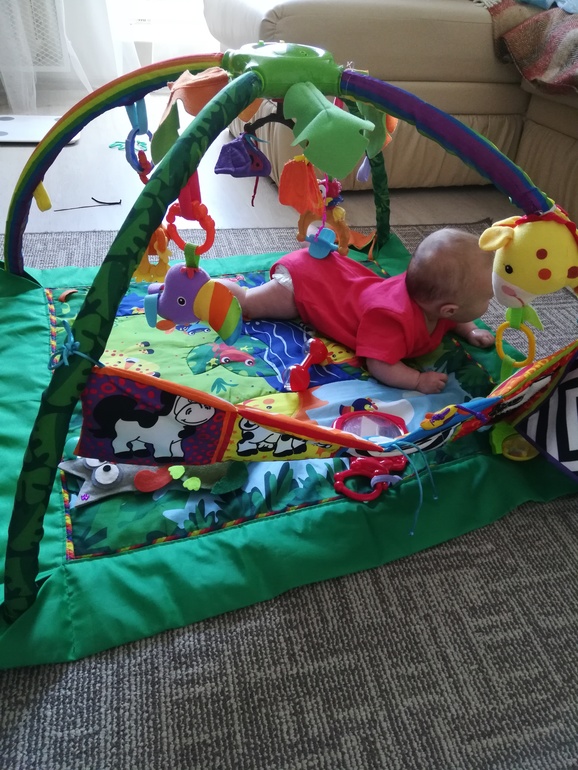 Взяли вчера же напрокат коврик. В этот раз решила не покупать, он и нужен-то буквально на месяц. Алиса тут же стала пытаться хватать игрушки руками, до этого больше ногами доставала, как обезьянка))