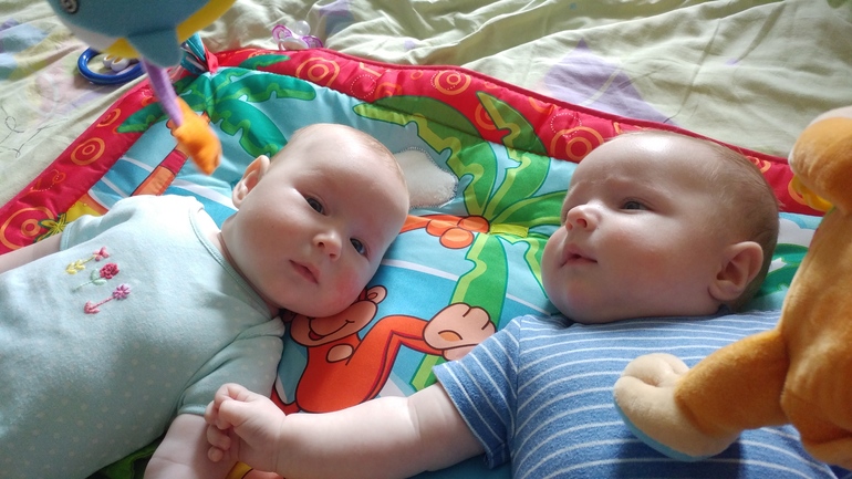 Мои кабачки уже совсем большие, 3.5 мес. Доча может довольно далеко проползти на попе, делает попытки переворота на живот. Сын лентяй, то тоже что-то там сучит ножками-ручками помаленьку). Обычно я занимаюсь своими делами, а они, если не в кроватках, лежат на развивающем коврике посередине нашей с мужем кровати. Я периодически с ними там заигрываю, из комнаты дальше чем в туалет не выхожу. Но уже как-то опасно мне кажется, решила переезжать на пол.