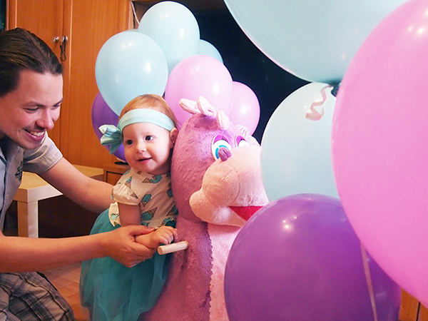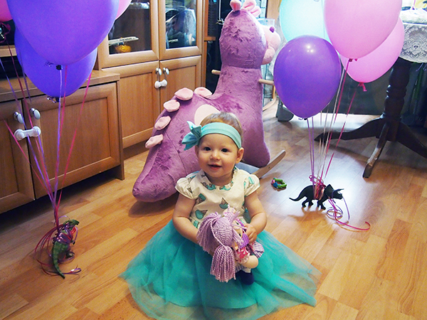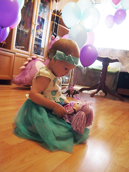 Первый День Рождения мы отметили тихо, почти все гости в последний момент не смогли приехать, и были только две бабушки и мы. Но я принесла кучу воздушных шаров (и даже шар в виде пончика - ну, потому что еще во время беременности мы прозвали малыша в животе Пончиком), сделала торт в меру своих возможностей, надела на девочку красивое платьице. Старалась все сделать в определенной цветовой гамме, хотя для домашнего праздника смысла в этом особо не было. Подарили ей динозавра-качалку и первую тряпичную куклу, ей все понравилось, куклу несколько дней не выпускала из рук, а на качалке просит покачать ее и сама потом качает свои игрушки.