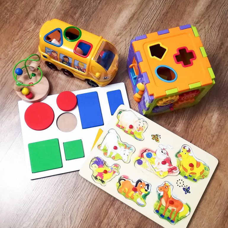 • Вкладыши. Рамки-вкладыши; активный куб или домик с отверстиями разной формы, в которые малышу нужно вставлять фигурки, с дверцами и ключами. Сложные фигурки пока Катя вставить, конечно, не может, но с кругами и квадратами вполне справляется.