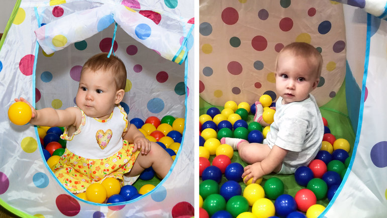 • Палатка с шариками. Любовь обеих моих девчонок. Это и домик, это и игра в прятки, это и купание в шариках. Можно раскидать все шарики, а потом собирать их в корзину, представляя, что это ягодки. Можно сортировать по цветам.
