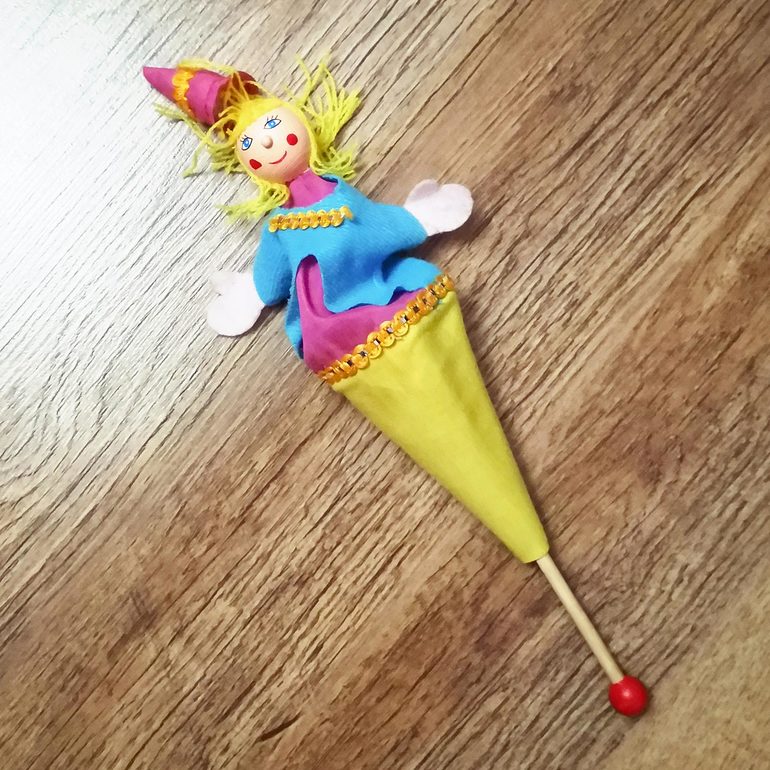• Кукла-перчатка или пальчиковые игрушки. Очень нас выручали в дороге. А еще очень хороша для дальних путешествий вот такая кукла на палочке, мы ее называем «хохотушка». Она прячется, а появляясь, хихикает (хихикаю при этом, конечно, я).