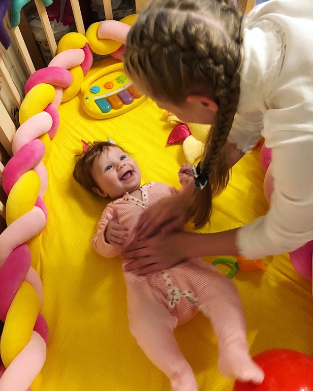 По кровати крутится, игрушки какие ей надо достает)) соску найдет - в рот вставит))