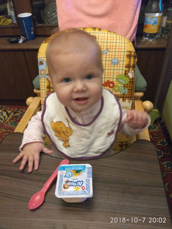 Ест кашу всякую разную. Рисовая - полное Г. Любаха морщилась и кривилась, но съела, т.к. привыкла есть все, что дают. Потом я понюхала, попробовала....безвкусная бумага какая-то. Была незамедлительно отправлена в помойку. Зачем портить настроение ребенку этой гадостью? Больше рисовую не покупаем. Зато любим все остальные виды каш) Они хоть запах имеют нормальный, и Любаха их хорошо ест. Любимую Агушу так же едим регулярно. И Нутрилончик пока ежедневно, хотя муж говорит, что можно уже и не давать. Творожки и пюрешки просто на ура! Это мы обожаем! И кашка на ночь. Остальное пока только пробуем. Я прежде чем что-то дать, спрашиваю у мужа, можно или нет. Он папа опытный, все знает) И много чего разрешает. А Любаха готова есть все. Ей все интересно и все нравится)) Кушаем теперь в стульчике как положено😊 Так мило это выглядит. Любаха к еде относится с уважением, ни разу ничего не выплюнула. Молодец!