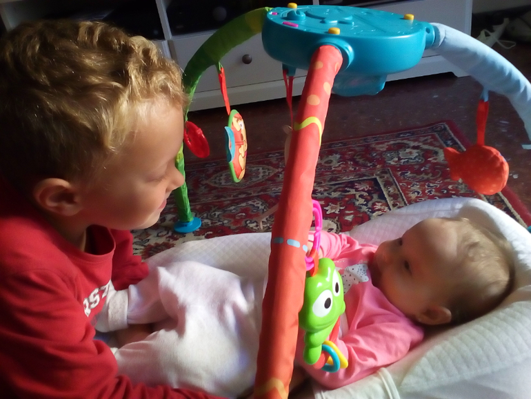 Отчёты по месяцамВес 6050, рост 62. Хорошо лежит на животе и высоко держит голову. В позе вертикально ещё страхую её и придерживаю. Гулит много и активно, играет с подвешенными игрушками подолгу, полюбила лежать в коконе (наконец-то), любопытная, хочет всё видеть. Узнаёт маму, папу, братьев, деда, бабу, крёстную. Стала клонить голову к левому плечу, пока наблюдаю. любит быть с братьями, смотреть на их игры, слушать как читаю сказки среднему. В коляску иногда не хочет ложится, пытается орать. Орёт дурниной в автокресле через раз. На ГВ, сосёт только если ей предложить, сама грудь не просит. Сосёт недолго, до сих пор только во время бодрствования, к концу месяца стала учиться иногда засыпать посасывая. Продолжает сосать кулаки и пальцы, но уже с меньшей страстью. Сосёт подвесные игрушки, когда получается запихать в рот. К концу месяца начала рассматривать свои руки и руки других с большим интересом. С начала месяца очень активно течёт слюна. Смотрит на себя в зеркало и улыбается. Улыбается очень много!!! Гулит и разговаривает больше всего со мной, с дедом, с Демьяном и своими игрушками.