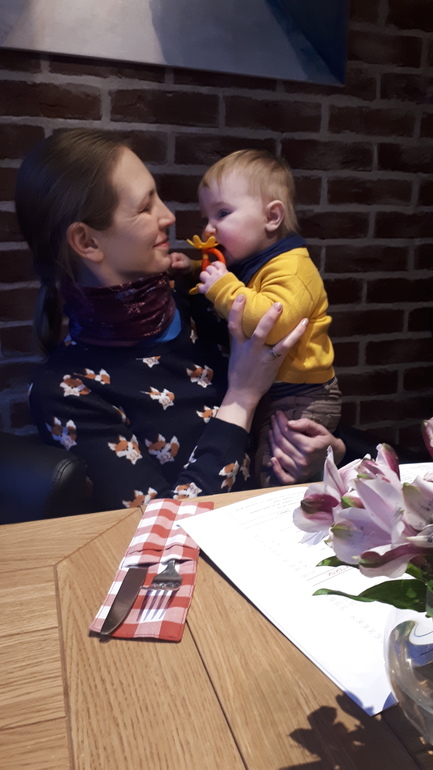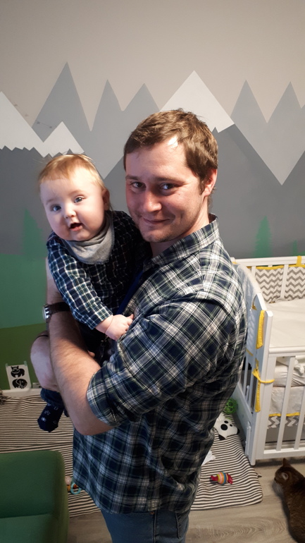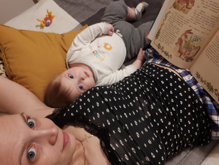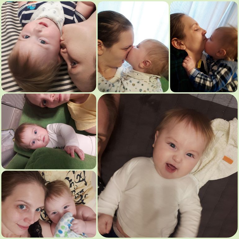 Много дурачимся с ним вдвоем. Любит меня "целовать": щеки, подбородок, нос грызть🤓, а еще к коленкам недавно пристрастился - прям набрасывается на них 🤣