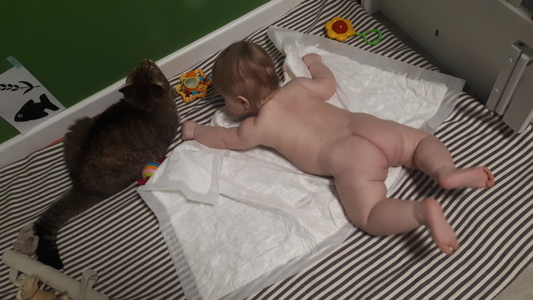 ✔ поворачивается со спины на бок - ага, раньше этого не было, сразу переворачивался, теперь может полежать так, поиграть чуть