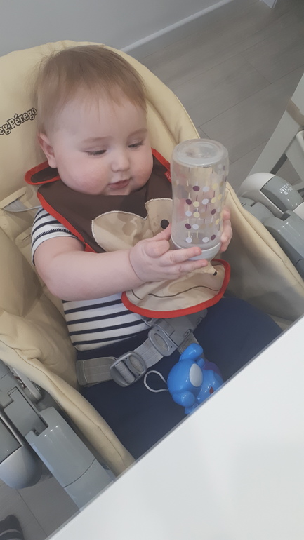 ✔ сам берет игрушки - пытается дотянуться, если что-то очень заинтересовало, и не будет брать, когда предлагаешь, если ему не интересна игрушка. Пару раз меня даже порадовал целенаправленными переворотами за игрушкой. Еще перестал сразу отпускать игрушку, когда берешь его на руки