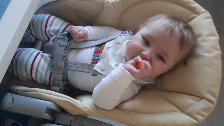 ✔ лежа на спине приподнимает корпус почти на половину в попытках сесть - все так же, дальше не продвинулся. Хотя на днях свекровь его к себе на грудь положила градусов под 45 и остальные 45° сам дотянул - сел. Но за сидение я это не засчитываю (и свекровь попросила так не делать пока нормально сам не сядет, она обиделась)