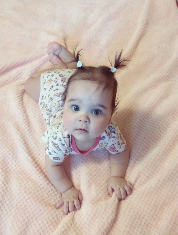 Как маленький бельчонок с такими хвостиками))) Лена,а ползает уже на четвереньках?