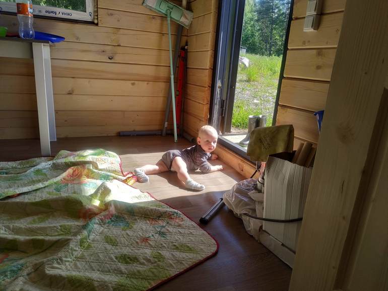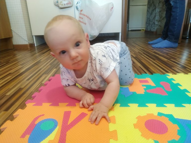 Там в Москве в отеле Женя начал четверенькать) Но так он шилопоп, то учиться ползать ему не досуг.
