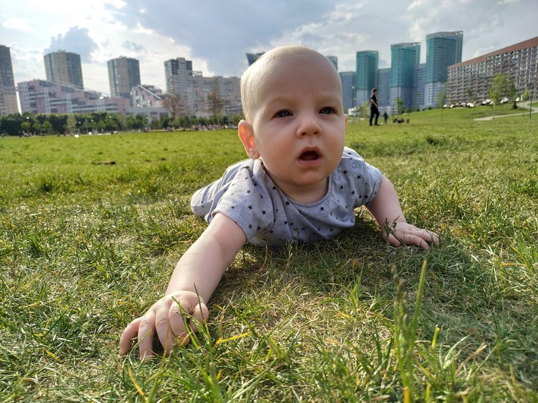 Ему некогда стоять, качаться, осваивать как поставить руку-ногу, он сразу вперед прыгает. Поэтому ползает до сих пор только по-пластунски, но очень быстро.