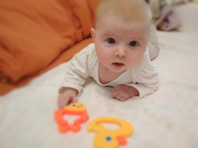 ✔️к игрушкам не тянет ручки, но если положить погремушку (любимую) на живот, будет трогать руками, может взять, трясти, потащить в рот, но до конца ещё не понимает зачем и как пользоваться руками.