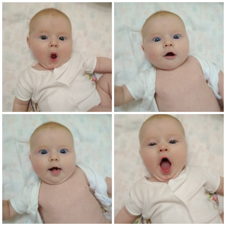 ✔️ближе к 3 мес хохотнула, раз в день смешок проскальзывает, стараюсь смешить,