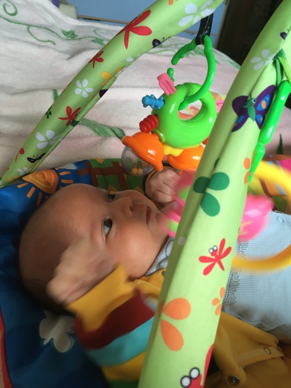 Играть, конечно, не играет, но на игрушки глазеет) Особенно любит смотреть на меня и на старшую сестренку. Внимательно смотрит и слушает, иногда сам болтает с нами))) Это так мило, он разговаривает мягко, как котенок. Стал осознанно улыбаться, чаще когда видит меня (видимо уже узнает).