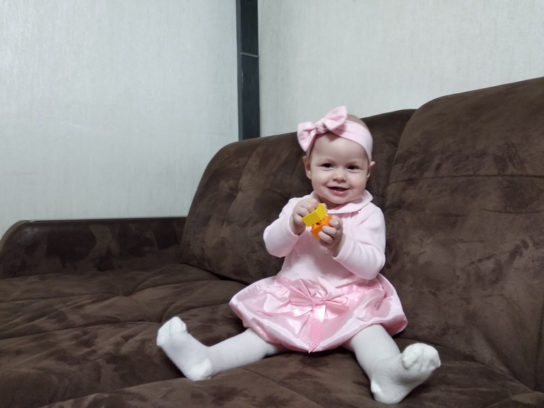 Физическое развитие: хорошо встаёт у опоры. Быстро-быстро подползает к дивану/коробке и встаёт. Отпускает одну руку и так уверенно стоит. Пыталась отпускать обе руки, падает и сильно расстраивается)) Ооочень-очень медленно может сделать несколько шажочков вдоль дивана приставным шагом.