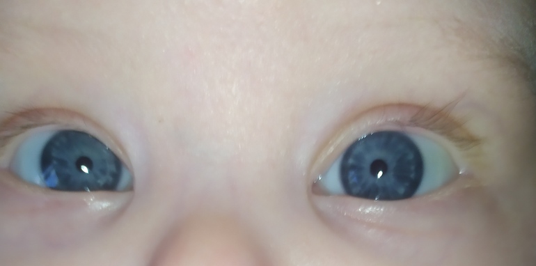 У меня голубые глаза, у мужа карие. Старшая доча кареглазая и мне так хотелось, что б младшая голубоглазка была, но не судьба( На фото дочины глаза в 1.5 месяца. Сейчас ей 2.5 и понятно уже, что будут карие
