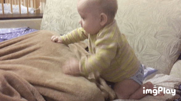 Отлично играет с братом. Вот недавно Глеб спрятался под одеялом, а Артём на него сверху прыгал. Потом Глеб показывался и тогда Артём быстро уползал к стене. И потом все заново. Всем весело.