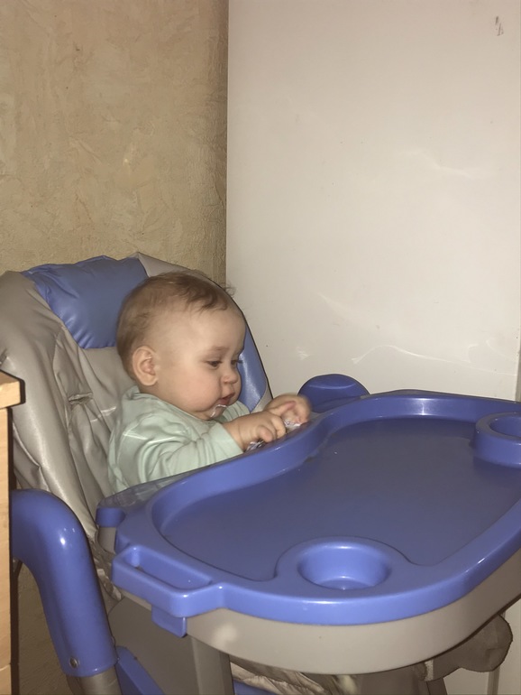 За столиком для кормления сидит, как царь-кормите меня.
