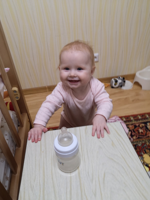 Баночная рыба так и не зашла, но рыба со взрослого стола - норм, даю маленькими кусочками. Вообще кусочками ест хорошо, накрошу чего нибудь на столик, сама берет, кладёт в рот, жуёт усердно. Но быстро надоедает, таким способом не поесть, а просто поиграть/попробовать. Но очень любит, когда родители кладут кусочки со своих тарелок Саше в рот. Даю грызть яблоко, тоже откусывает прилично, жуёт. Сырую тыкву любит, за хурму душу продаст. Когда ест печенье - в печенье всё, что поблизости 🙈 Вообще чаще ест голая, проще её отмыть под душем, нежели отстирывать её одежду. Даю йогурт, творог, биолакт и кефир - нравится, заменили ещё одно кормление смесью на кисломолочку. Теперь смесь только утром и ночью, и иногда перед дневным сном, а на ночь даю жидкие каши магазинные. В последнюю неделю аппетит безобразный, ничего практически не ест. Воду пьёт плохо, поильниками не получается, из кружки норм.