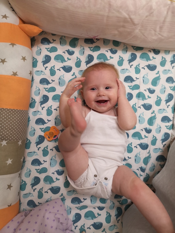 Ходили в гости к двойнятам (на 3 недели старше Саши). Сначала парни плакали и Саша за компанию, а то чо все орут, а она нет)) мне было смешно, три орущих человека, потом попривыкли и было норм. Саша не стеснительная, проявляла инициативу в общении, облизала все игрушки) а потом через 4 дня парни уехали в инфекционку с ротовирусом. Я переживала очень, но нас не зацепило.