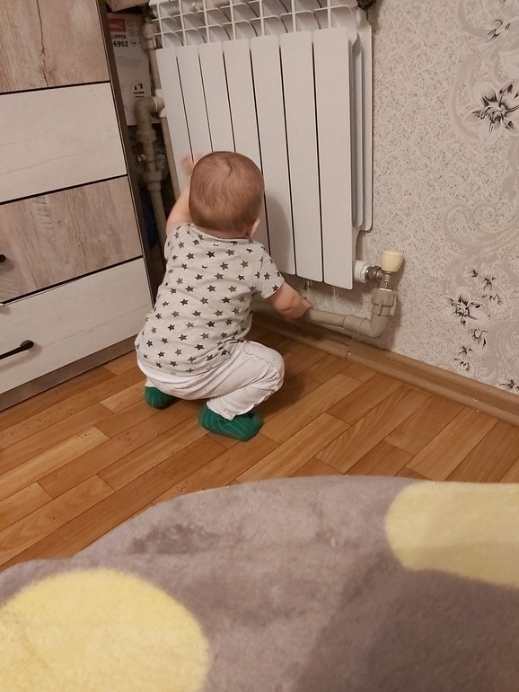 Наконец то осознанные ладушки, машет рукой пока-пока, играет в прятки(прячется под пеленкой)на крик отвечает криком старшему сыну, то есть пытается передразнить его. Хорошо ходит возле опоры, встаёт с вытянутых рук,на ноги, думаю пытается встать без опоры, так как ноги выпрямляет. У старшего сына забирает джойстик от приставки, тыкает пальцами, и смотрит на экран, что происходит