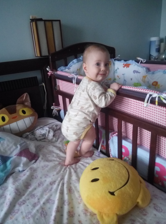 Зацепилась руками за кроватку, подтянулась. Ножками сначала на коленях встала (так делает уже недели 2)а потом бац и на ноги 😳 и сделала пару шажочков ближе к кровати 😳