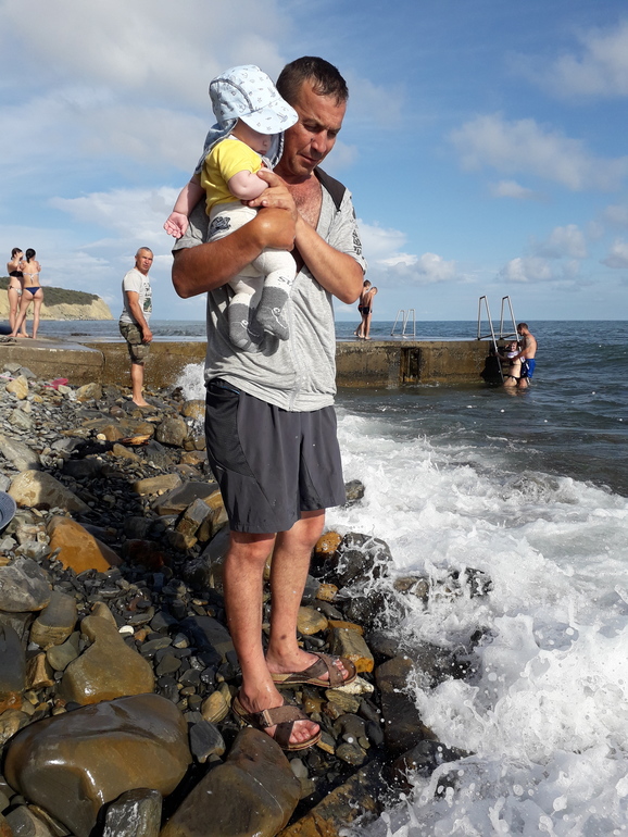 Эмоций у Лёхи было просто масса! Сначала он оооочень серьезно рассматривал всю эту огромную водную мощь и пытался поимать ртом легкий бриз, а потом расслабился и даже камушки покидал. В этот раз ножки даже не мочили, хоть и вода 22 градуса. Сильно жарило солнце. Мы решили сначала просто познакомить малыша с море-морем). В следующий раз поедем 1 июля опять на двое суток, но на чистейший пляж, отдыхать. Вот туда я и бассеин подготовила и защитный крем. Но всеравно силбно раздевать не буду, очень палящее у нас на Кубани солнышко.