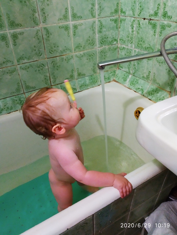 Купили зубную щётку, осваиваем. Просто даю в руки и Катя тянет в рот и типо что-то там чистит 😏
