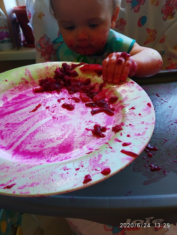 Очень большой прогресс в прикорме! Кушаем очень много всего! Все возможные ягоды ( клубнику, шелковицу, малину, черешню), чечевица, шпинат, томат, свекла, кукуруза, персик, абрикос, ввела недавно льняное масло, которое богато на омегу 👆